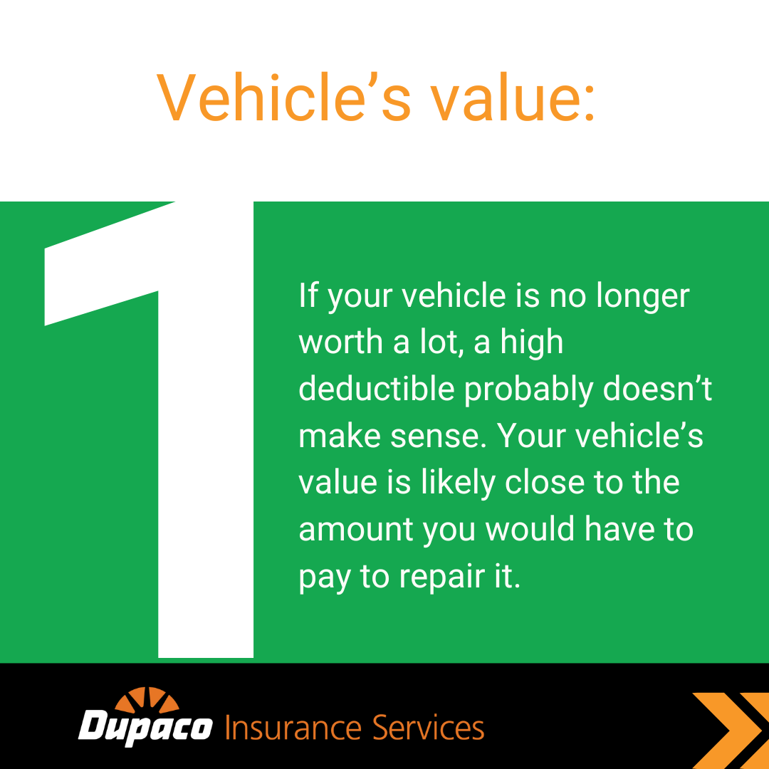 The value of your vehicle matters a lot. If your car is older and worth only a few thousand dollars, choosing a very high deductible may not make sense. You could end up paying nearly as much as the car is worth in repairs.